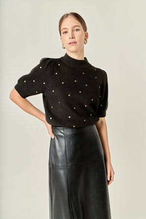 Fall in love with the details. The Heart Embroidered Puff Sleeve Knit Top brings a playful yet polished touch to your everyday look. Designed with soft knit fabric, subtle heart embroidery, and feminine puff sleeves, this top perfectly balances comfort and charm. The ribbed trim adds structure to the silhouette, making it easy to pair with jeans, skirts, or tailored pants. Whether you're dressing it up for a date or keeping it casual, this top is an instant mood-lifter.